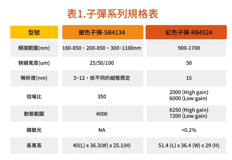 台湾超微光学新开发超微型光谱仪银色子弹&红色子弹系列(Silver Bullet;SB & Red Bullet;RB),分别对应短波长与长波长量测,SB量测波长范围可从180~850nm或300~1100nm,狭缝50um的条件下分辨率<7nm,适合应用在水质与生医检测应用。其体积小且重量轻,系统整合弹性高,是终端系统整合的好选择,亦是手持量测应用的好夥伴。